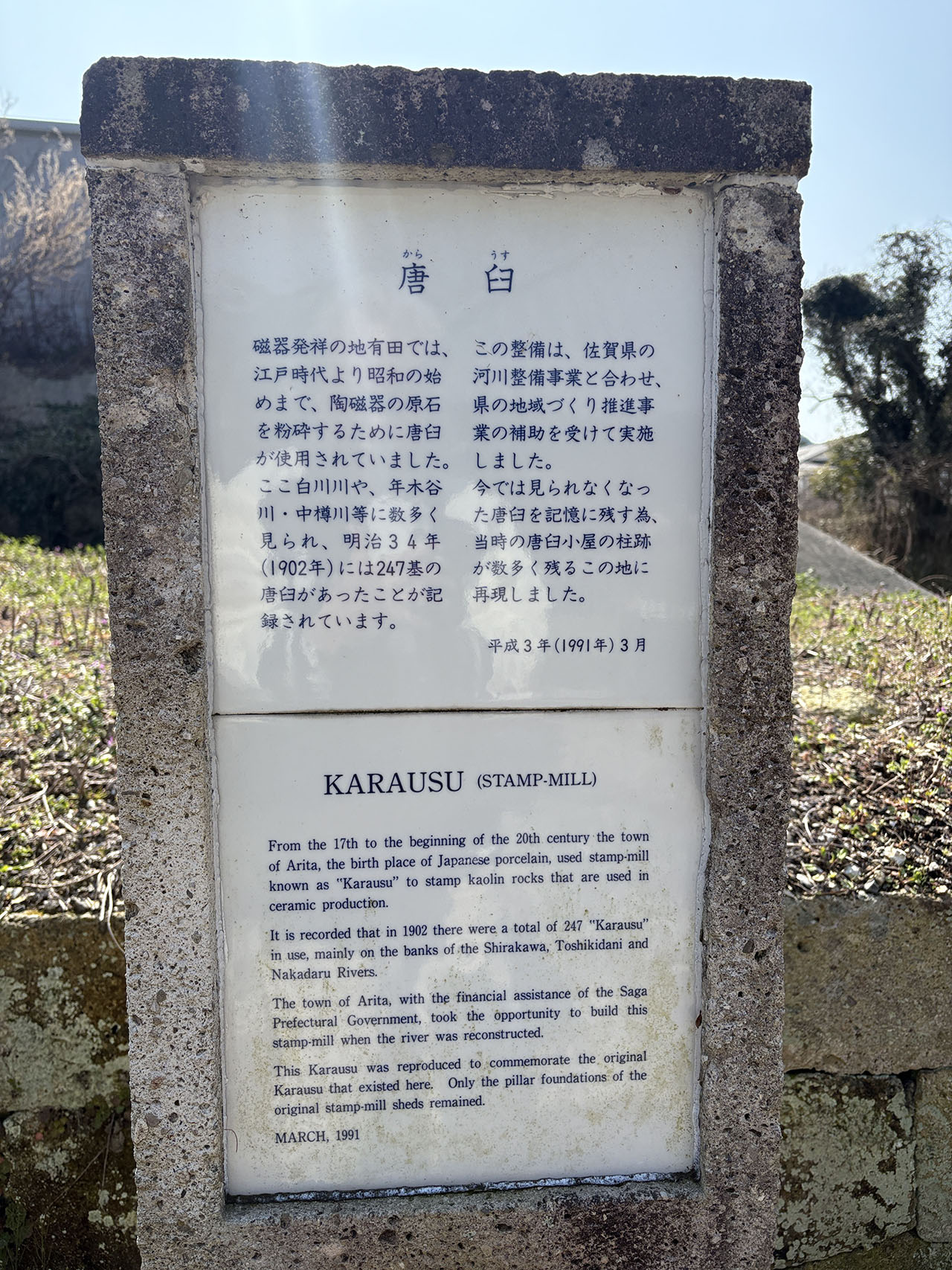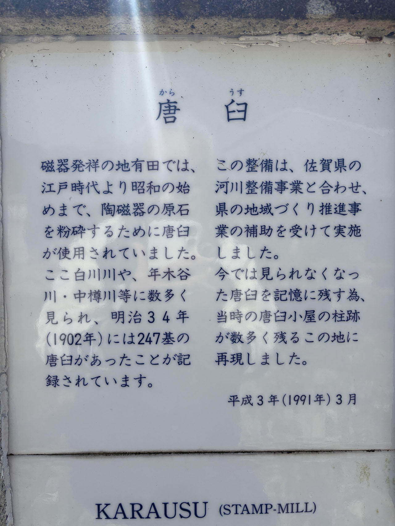 磁器発祥の地有田では、江戸時代より昭和の始めまで、陶磁器の原石を粉砕するために唐臼が使用されていました。