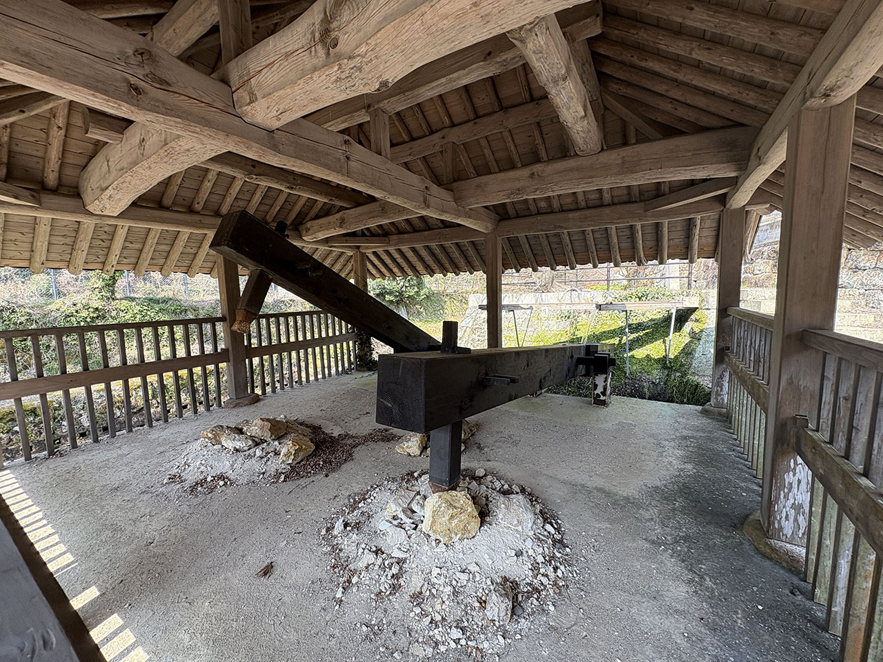 今では見られなくなった唐臼を記憶に残す為、当時の唐臼小屋の柱跡が数多く残るこの地に再現しました。