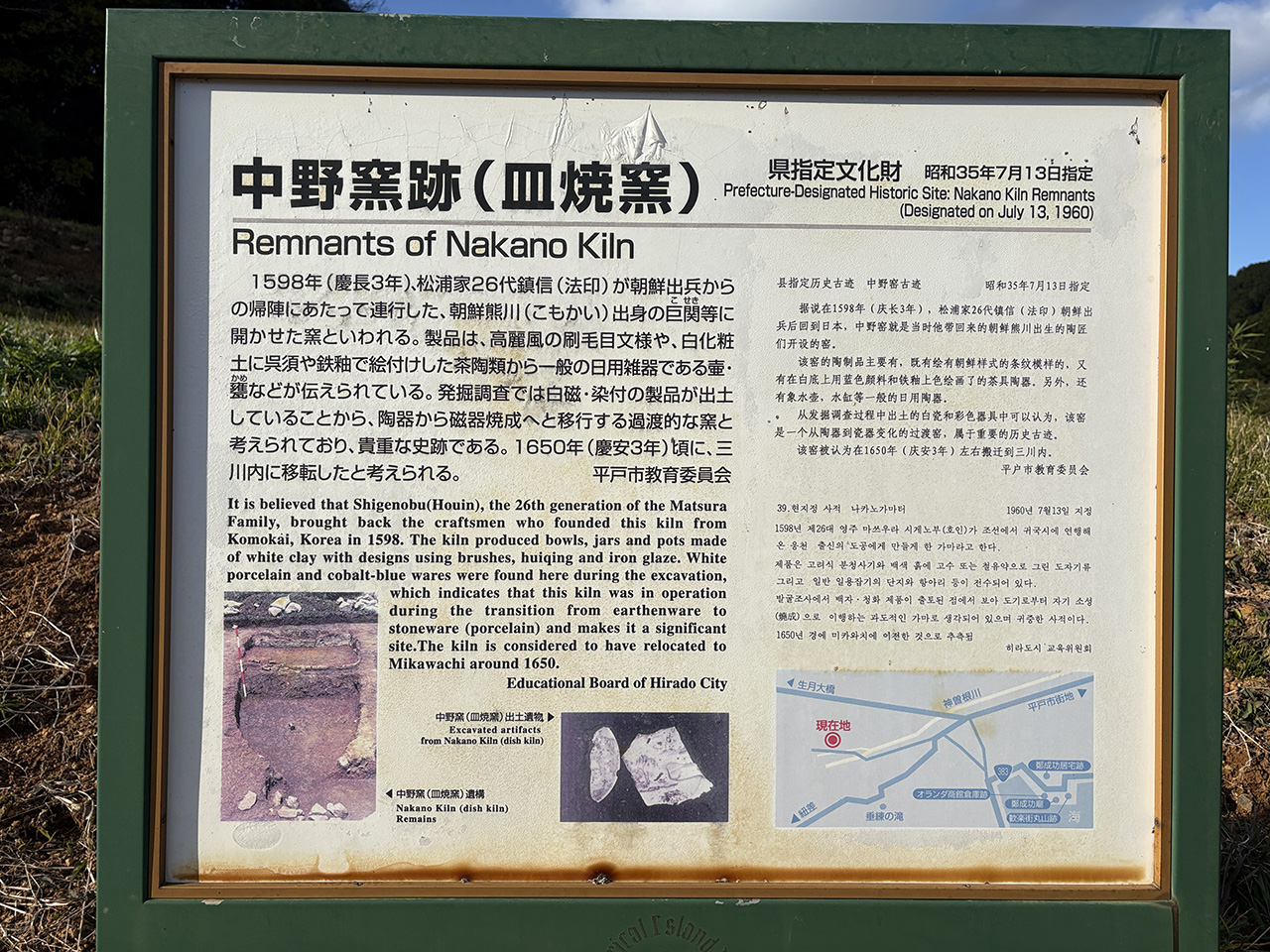 製品は、高麗風の刷毛目文様や、白化粧土に呉須(ごす)や鉄釉(てつゆう)で絵付けした茶陶類から一般の日用雑器である壺(つぼ)・甕(かめ)などが伝えられている。発掘調査では白磁・染付の製品が出土していることから、陶器から磁器焼成へと移行する過渡的な窯と考えられており、貴重な史跡である。1650年(慶安3年)頃に、三川内に移転したと考えられる。