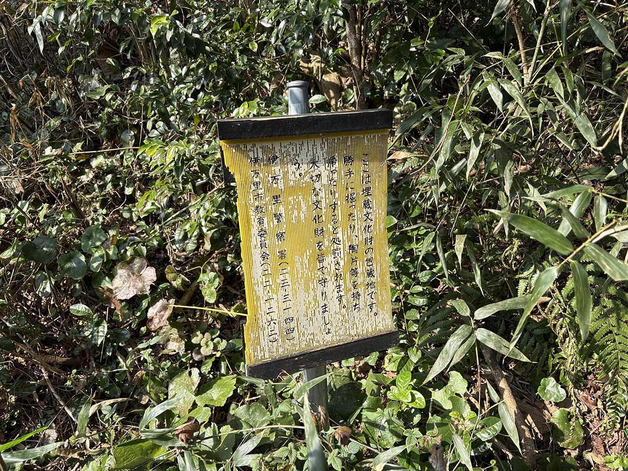 ここは、埋蔵文化財の包蔵地です。勝手に掘ったり、陶片等を持ち帰ったりすると処罰されます。大切な文化財を皆で守りましょう。
