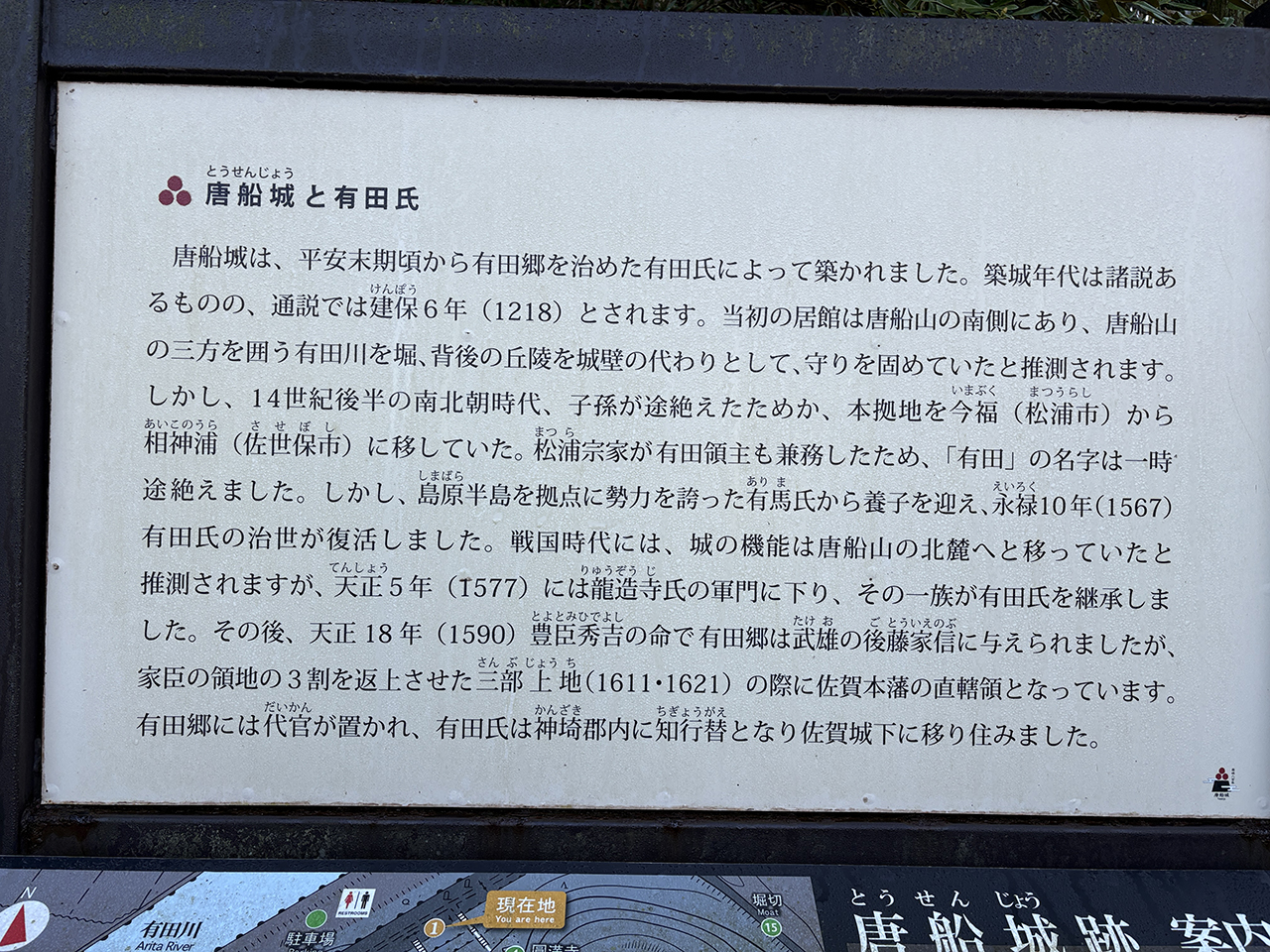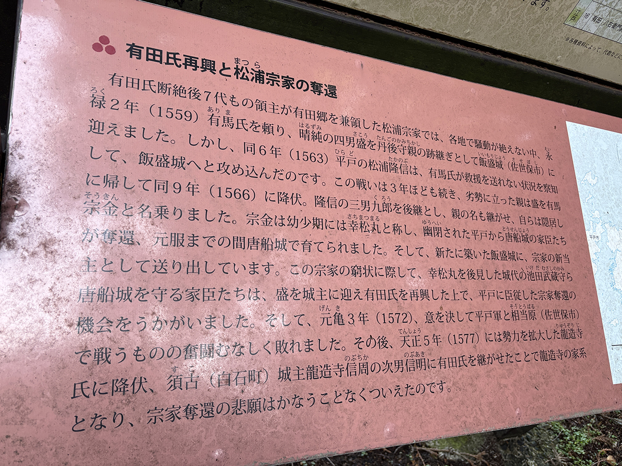 しかし、14世紀後半の南北朝時代、子孫が途絶えたためか、本拠地を今福(松浦市)から相神浦(佐世保市)に移していた。松浦宗家が有田領主も兼務したため、「有田」の名字は一時途絶えました。しかし、島原半島を拠点に勢力を誇った有馬氏から養子を迎え、永禄10年(1567)有田氏の治世が復活しました。戦国時代には、城の機能は唐船山の北麓へと移っていたと推測されますが、天正5年(1577)には龍造寺(りゅうぞうじ)氏の軍門に下り、その一族が有田氏を継承しました。その後、天正18年(1590)豊臣秀吉の命で有田郷は武雄の後藤家信に与えられましたが、家臣の領地の3割を返上させた三部上地(1611・1621)の際に佐賀本藩の直轄領となっています。