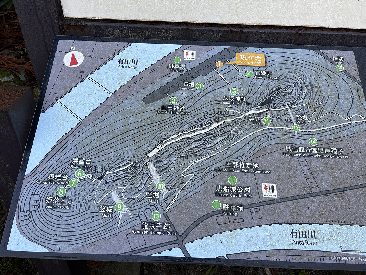 唐船城(とうせんじょう)の所在地は、佐賀県西松浦郡有田町山谷牧(やまやぼく)です。山谷駅(松浦鉄道)から徒歩圏内で、唐船城公園や山田神社(唐船城跡)として整備されており、当時の竪堀や狼煙台跡が残っています。