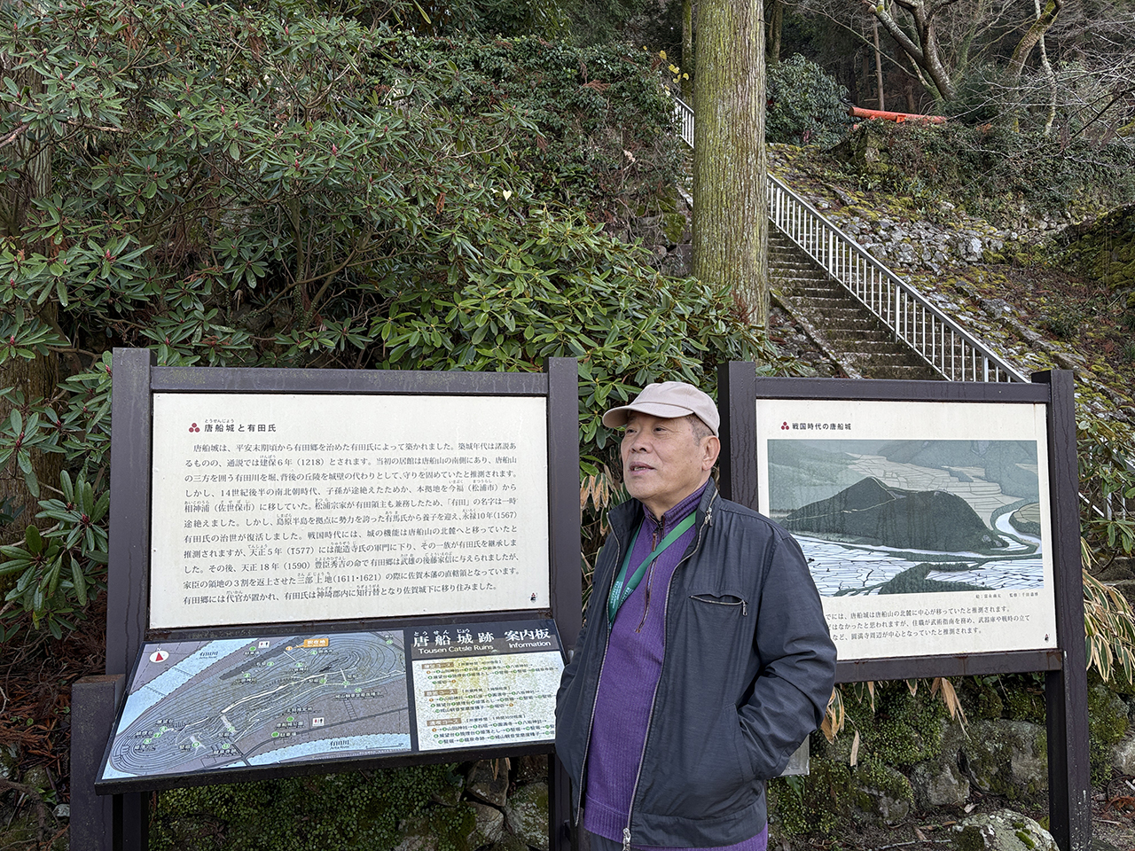 唐船城は、平安末期頃から有田郷を治めた有田氏によって築かれました。築城年代は諸説あるものの、通説では建保6年(1218)とされます。当初の居館は唐船山の南側にあり、唐船山の三方を囲う有田川を堀、背後の丘陵を城壁の代わりとして、守りを固めていたと推測されます。