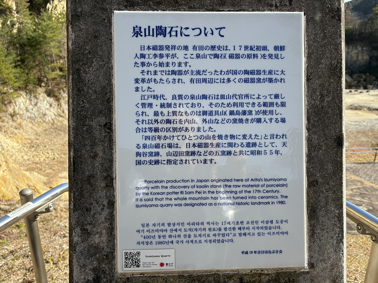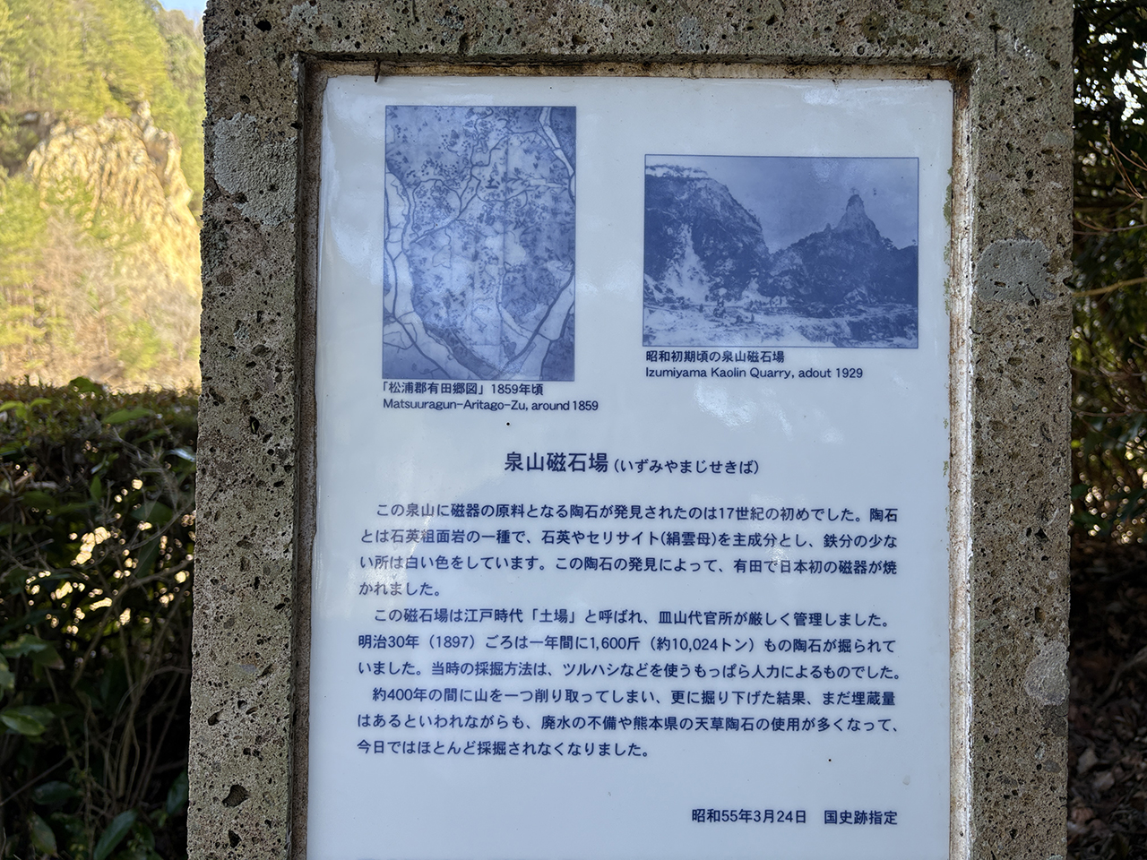 「四百年かけてひとつの山を焼き物に変えた」と言われる泉山磁石場は、日本磁器生産に関わる遺跡として、天狗谷窯跡、山辺田窯跡などの五窯跡と共に昭和55年、国の史跡に指定されています。
