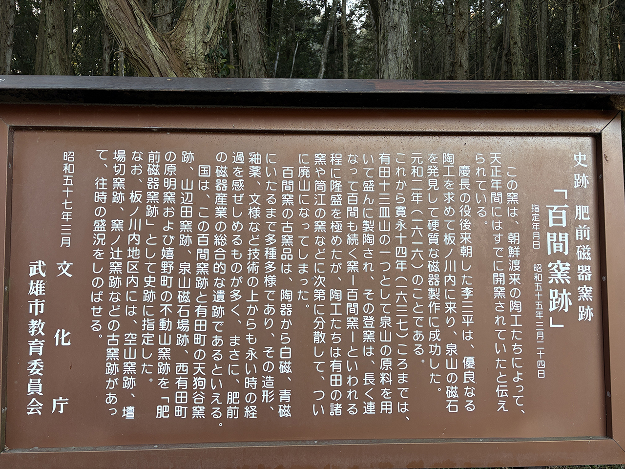 慶長の役後来朝した李三平は、優良なる陶工を求めて板ノ川内に来り、泉山の磁石を発見して硬質な磁器製作に成功した。元和2年(1616)のことである。