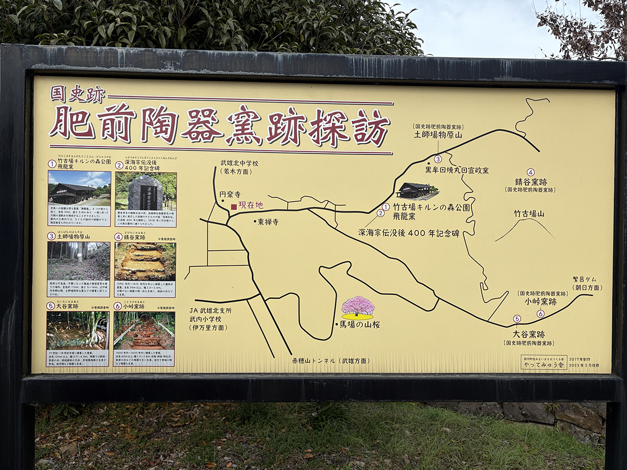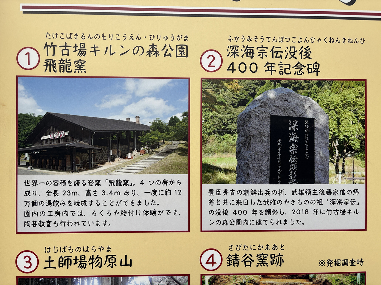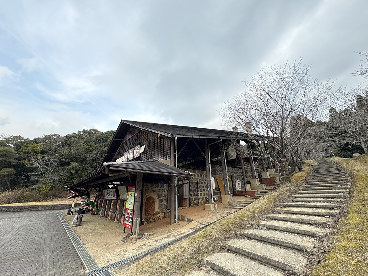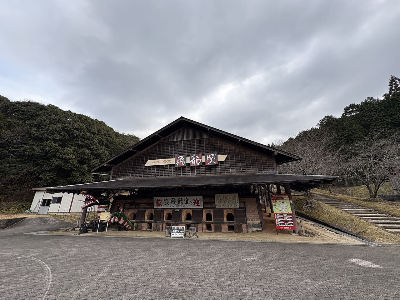 飛龍窯 飛龍窯『武雄市』 ■構成文化財の解説 武内町黒牟田地区に、陶芸の里武雄の拠点として作られた世界一の容積を誇る登り窯「飛龍窯」。これは、4つの房から成り、その一つの房の大きさは奥行き8.9m、幅3.8m、高さ3.4mで大型バス1台と同じくらいの規模である。全長は23mで、一度に約12万個の湯飲みを焼成することができる。 園内には、貸し出しが出来る登り窯「向窯」もある。また、エ房ではろくろや手びねり、絵付け体験ができ、陶芸教室も行われている。